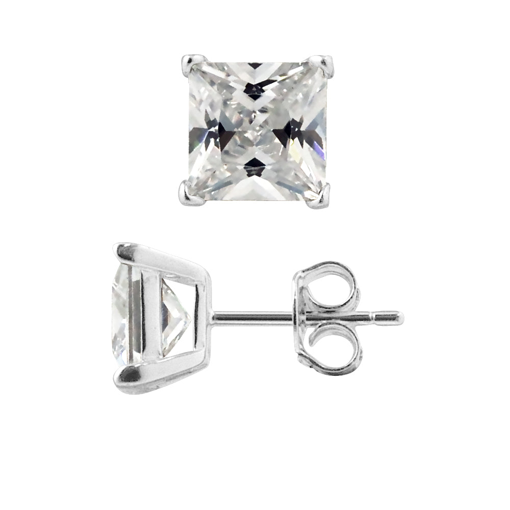 Boucles d'Oreilles Oxydes de Zirconium carré - 7 mm x 7 mm - sertie de 4 Griffes - Système Poussette - Argent 925 Millièmes Rhodié